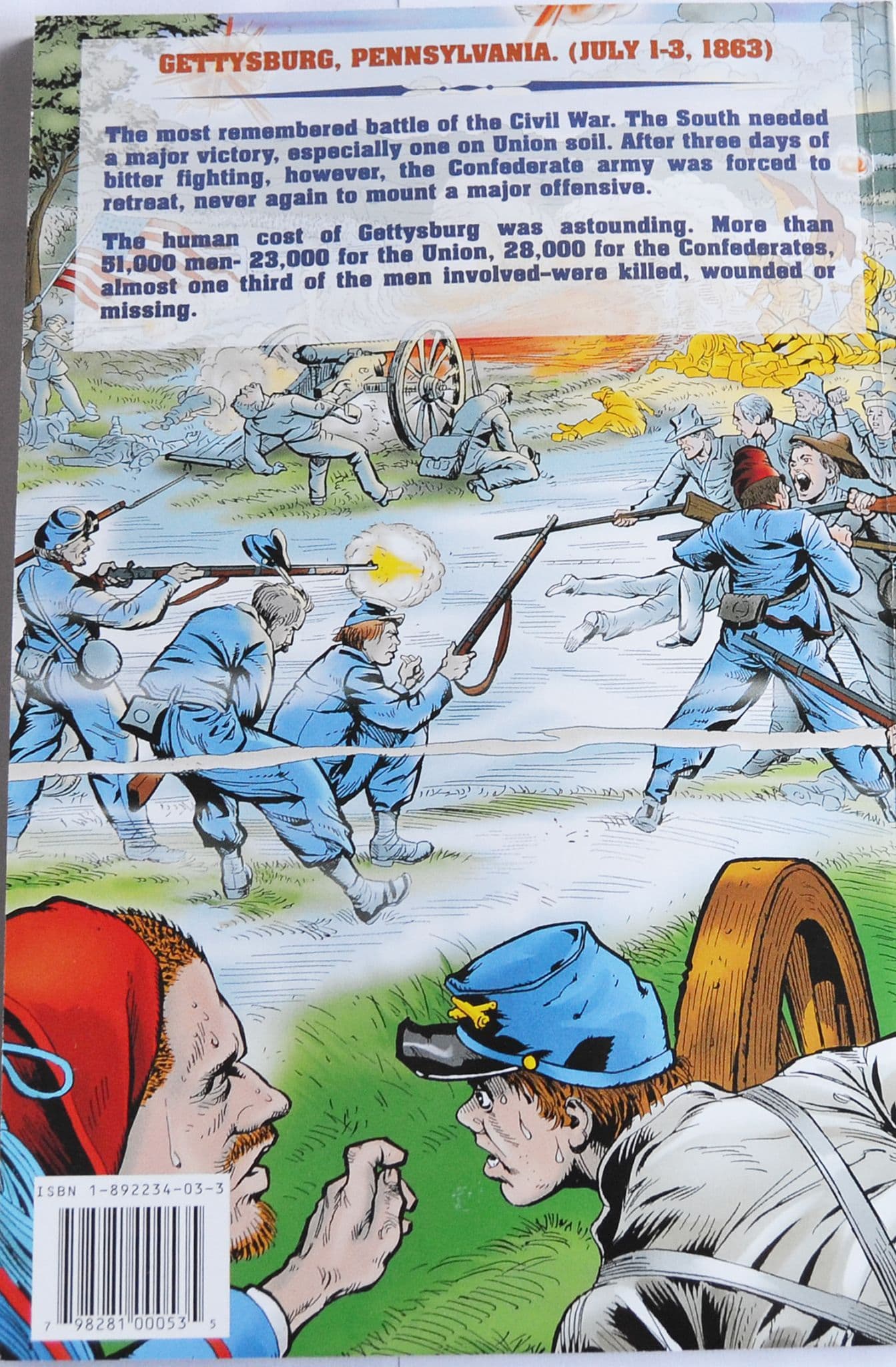 The most remembered battle of the Civil War. The South needed a major victory, especially one on Union soil. After Three days of bitter fighting, however, the Confederacy army was forced to retreat, never again to mount a major offensive. The human cost of Gettysburg was astounding. More than 51,000 men- 23,000 for the Union, 28,000 for the Confederates, almost one third of the men involved- were killed, wounded or missing. Part of the historical comic book series "Epic Battles of the Civil War," which were produced by noted Historians in cooperation with the world-famous Marvel Entertainment Group.